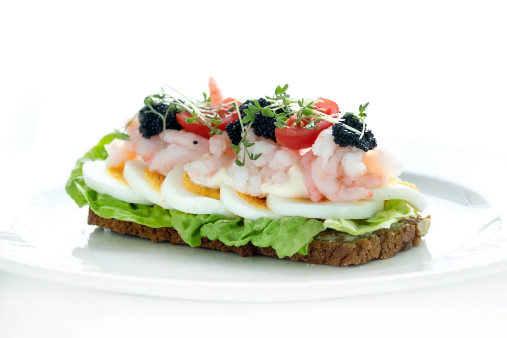 Färska, saftiga räkor på ett gott rågbröd, toppat med kokt ägg, krämig majonnäs, en skiva citron, färsk dill och lite kaviar – en klassiker som alltid uppskattas.
