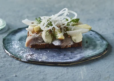 Fininlagd sill av högsta kvalitet, toppad med tunt skivad röd- och gul lök, färsk dill, små kokta potatiskuber och en klick krämig crème fraîche, serverad på mörkt, krispigt rågbröd – elegant och traditionell dansk favorit med raffinerade smaker.