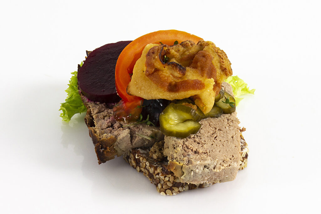 Mjukt leverpastej på mörkt bröd, krispigt bacon, lite sky, skivade rödbetor och rå lök – en varm och mustig smakupplevelse med klassiska smaker.