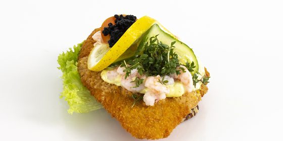 Krispig, panerad fiskfilé på mörkt rågbröd, toppad med färska räkor, citron, lite rostade kapris och färska örter. Serveras med krispig sallad och ett stänk av dill – en klassiker med elegant twist.
