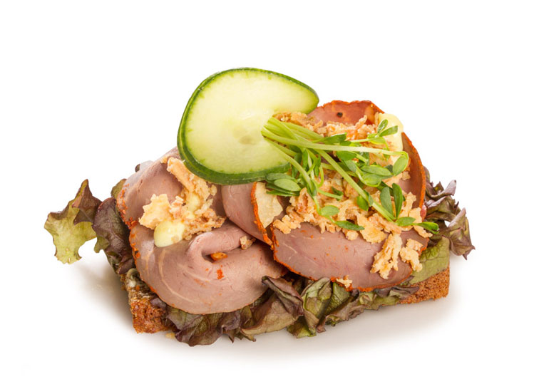 Mört rostbiffkött med fyllig remouladsås, rostade lökringar och pickles på ett frasigt rågbröd – perfekt kombination av sälta och syra.